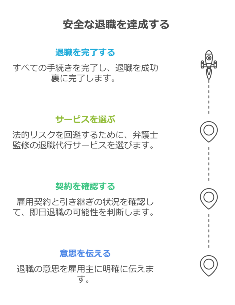 退職代行で即日退職を実現することは法律的に問題ありません。しかし、業者選びや手続きの進め方を誤るとトラブルの原因となることがあります。弁護士監修の退職代行サービスを利用し、必要な準備を整えることで、安全かつスムーズに退職を進めることが可能です。