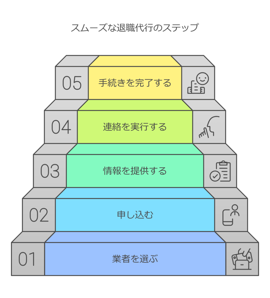 退職代行のやり方は、以下の5つのステップで進めるのが基本です。